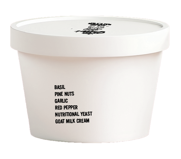 Goat Butter (Pasteurized Goat Milk Cream), Basil, Pine Nuts, Garlic, Lemon, Red Pepper.